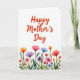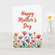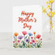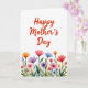 This Mother's Day card features a tall layout with plenty of white space and a gentle watercolor look. Near the top, the words “Happy Mother’s Day” sit centered in warm coral-red lettering, drawing the eye first. The apostrophe in “Mother’s” is shaped like a tiny heart ❤️, adding a sweet touch that feels like a quiet hug in print. Across the lower third, a row of flowers spreads outward like a shared bouquet, with blossoms in fuchsia, violet, orange, blue, and rosy pinks. Soft green stems and slender leaves weave between the blooms, giving the scene the look of a small garden bed in spring 🌼. The paint edges lightly feather and blend, creating tender transitions of color that make the flowers feel close and cared for. The bottom area is filled with layered petals and scattered buds, with the brightest blooms clustered near the center and tapering toward the sides.