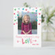 Send love this Valentine’s Day with this bright and cheerful photo card. Hand drawn hearts encircle your photograph and hand lettered “love” featured on the front. Back of card has a bright multi-colored stripe on it.