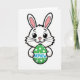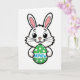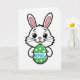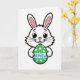 This card features a front-facing white bunny with black outlines on a plain white background, giving it a simple, airy look 🐰. Its long upright ears show soft pink inner details, and its big dark eyes with tiny lashes create a gentle, friendly gaze. A small pink nose and a slight smile with two front teeth add a sweet, affectionate expression, like it’s posing for someone it cares about. Fine whiskers stretch from both cheeks, adding a classic cartoon touch without crowding the space. Held close in its paws is an oval egg-shaped decoration in green with scattered white polka dots, as if it’s being offered like a small gift 🌷. Across the middle of the egg runs a blue horizontal band, and on that band the word “NEPHEW” appears in clear uppercase letters. The layout keeps the bunny centered and large, with the text placed directly on the blue band so it stands out at a glance. The green egg, white dots, and blue band sit sharply against the white background, with the pink ear interiors and nose adding soft accents.