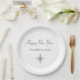 Happy New Year 2024 holiday party paper plate, with a simple snowflake design and customizable typography lettering. A simple yet festive addition to your New Year's party celebration.