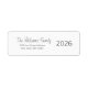 Modern Happy New Year 2026 return address label simple typography design. Set on a white background, this label has gray customizable typography where you add your own lettering. A simple addition to your cards and invitations this holiday season.
