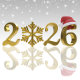 This elegant illustration features the year 2026 in shiny golden typography. The zero is replaced by a detailed gold snowflake, while the final number is decorated with a red Santa hat. The design has a luxurious and festive appearance, making it ideal for Christmas and New Year discount cards for promotion, special offers and sales.