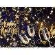 A festive New Year celebration scene featuring a sparkling champagne bottle and two flutes filled with bubbly. The background is a deep navy blue adorned with golden stars, shimmering confetti, and circular patterns.