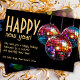 A different, but sparkling New year Holiday card with trendy disco balls in sparkling colors. The background black making the disco balls, colors and golden text pop.The font is in a retro and groovy style as the disco era in the 70s. the back has the light flairs from the disco balls as a fun color splash.
