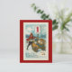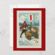 Designed by Susan Epps Oliver. Vintage image of a young boy pushing a wooden wheelbarrow which has a sack full of coins spilling from it as well as a sign saying January 1st. He is in a snowy landscape with a train passing by in the background.