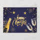 A festive New Year celebration scene featuring a sparkling champagne bottle and two flutes filled with bubbly. The background is a deep navy blue adorned with golden stars, shimmering confetti, and circular patterns.