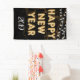 This Happy New Year banner features gold foil balloons and string lights on a black background. Personalize it with the year.