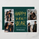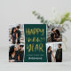 Rustic and festive holiday photo card features four photos in a collage layout, with "Happy New Year" in gold foil hand lettered typography on a forest green background. Personalize with your names beneath.