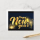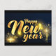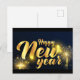 Happy New Year golden text with fireworks and dark blue background, festive celebration, postcard design, elegant typography, for the holiday season.