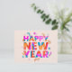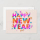 A digital art piece features the words "HAPPY NEW YEAR" cut out from a light peach background, revealing a vibrant, multi-layered design beneath. The letters are filled with a mix of bright pink, orange, and blue hues, creating a playful and festive effect. Small, colorful dots and squiggles in matching colors are scattered around the letters, adding to the whimsical feel. The overall style is modern and graphic, with a clean, crisp finish.