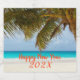 Custom New Years Eve party labels for wine or sparkling wine bottles with a tropical theme. A palm tree sways over turquoise ocean water as the background for red text.