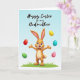 Designed with a cheerful bunny character in soft golden-orange and cream tones, the front shows wide blue eyes, a bright smile, and open arms that read like an eager hug 🐰. A small fluffy tail peeks out behind, adding cozy texture against the smooth, animated look of the figure. The bunny stands on a narrow strip of emerald-green grass, suggesting a sunny outdoor moment where friendship feels close and easy. Above and around the bunny, five glossy egg shapes drift in the sky, arranged to feel like they’re gently circling the character 🐇. The eggs are colored red, yellow, turquoise, green, and pink, each with a light sheen that makes them appear rounded and softly lit. At the top of the design, a dark, flowing line of text stretches across the upper area, standing out clearly against a pale blue-to-light horizon gradient. The background transitions from light blue at the top to a softer, lighter tone near the grass, with the colorful eggs floating at different heights.