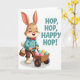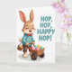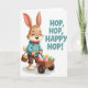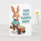 This card shows a cheerful, long-eared bunny-like character striding across a white background, pushing a small wooden two-wheeled cart piled high with pastel egg-shaped treats 🐰. Its eyes are closed in laughter, cheeks softly pink, and its open smile gives it the look of someone hurrying to meet a friend with a surprise. The character wears a light blue collared jacket with two gold buttons, a red bow tie, and simple brown trousers, adding a tidy, friendly charm. A woven basket hangs from its left arm, also filled with glossy eggs in soft pink, teal, and sunny yellow, with a few lightly speckled for texture 🌷. The eggs catch highlights as if just polished, and the cart’s wood grain and basket weave add cozy detail against the plain backdrop. To the right, rounded teal text reads “HOP, HOP, HAPPY HOP!” in large letters that sit at about the character’s shoulder height. A faint shadow under the bunny and cart anchors them to the page, and the teal lettering stands out crisply on the open white space.