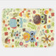 One owl with teal head and wings and golden yellow body with a flower pattern in red, white and teal. The second one is teal head and body with red wings wings with light beige pattern and the third one is chocolate brwon head and body with golden wings with red and teal patterns.The background are filled with flowers in red, golden yellow teal and hearts in red, teal and golden yellow. 2 birds are in golden yellow and teal body with chocolate brown and red with light beige and teal patterns on wings. Also there are circular patterns in light beige in the background. This is a digital illustration.