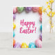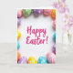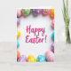 This greeting card features a ring of decorated Easter eggs curving around a bright white center, like a friendly frame inviting your eyes inward 🌷. The eggs mix soft pastels with stronger pops of yellow, green, pink, and purple, creating a lively border that feels like a group of friends gathered close. Some eggs are dotted with tiny white polka dots, while others have loose white painted swirls that look like gentle brushstrokes shared between two people. Subtle shadows under each egg add depth, making the arrangement feel layered and cozy rather than flat. In the middle, a short holiday message sits centered in fuchsia lettering, standing out clearly against the white space. The text is large and easy to spot, with the bright color echoing nearby pink tones in the egg designs 🐰. The white background stays open and uncluttered, while the eggs form a wavy, continuous border along the edges with alternating dot and swirl patterns.