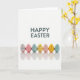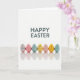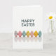 This card features a bright white background that keeps the scene airy and open, with a gentle, celebratory feel. Along the lower third, seven decorated egg shapes sit in a neat row, close enough to feel like friendly companions gathered side by side 🐰. Their colors mix soft pinks, light teals, and sunny yellows, creating a sweet, cozy contrast against the white space. Some eggs show tidy horizontal stripes in pale blue and pink, while others have dotted patterns like small white polka dots on teal or tiny red specks on a light pink surface 🌷. Beneath each egg, a glossy reflection mirrors its shape, like a quiet twin leaning in close, adding symmetry and a soft romantic touch to the lineup. Above the eggs, large uppercase text in a dark tone is centered near the top, leaving generous space between the greeting and the decorated row. The lighting stays smooth and even, and the eggs appear polished with crisp edges and clear reflections on the white surface.