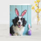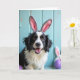 This card features a black-and-white furry companion centered in the frame, looking straight at you with a wide, open-mouthed grin that shows a peek of pink tongue and bright teeth. Behind it, light turquoise wooden panels form a calm, slightly weathered backdrop that feels like a cozy spring setting. A soft headband sits between its ears, topped with tall grey bunny ears lined in pink, adding a sweet, friendly touch 🐰. The animal’s amber eyes catch the light in a way that suggests a warm, affectionate connection, like it’s sharing a private joke with someone close. Gentle, even lighting brings out the texture of its coat and the fine whiskers along its muzzle. In the lower right, a small white plush bunny with pink ears rests near a glossy purple egg, adding a quiet seasonal note 🌷. The greeting appears near the top in a simple, light-colored font that stands out against the turquoise boards, while the bottom corner stays mostly open to keep focus on the smiling face and the bunny ears.