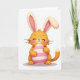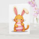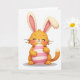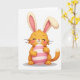 This card features a cute, human-like bunny figure in a soft golden-orange tone, set against a plain white background with a gentle shadow beneath. Its long curved ears have creamy outer fur and blush-pink inner details, and its closed eyes with tiny lashes give it a calm, affectionate look 🐰. A small heart-shaped nose and rosy cheeks add to the tender expression, as if it’s quietly enjoying a sweet moment. The bunny holds a large oval egg close to its body, suggesting a friendly, sharing kind of closeness 🐇. The egg is decorated with simple horizontal stripes in white and pastel pink, keeping the scene light and springlike. Near the top, a short greeting appears in soft pink lettering, centered and spaced to leave plenty of white space around the character. The warm orange fur and gentle pink accents stand out clearly, with the striped egg nestled in the bunny’s arms.