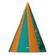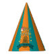 Adorable fun birthday party hats to brighten up your party. Over an orange background the design starts from the top with Happy Birthday in green and yellow text with a cake with pink icing and three lit candles next ti the H in happy. Below the text is a cute funny happy brown potato with stick arms and a big smile. Across the potato is a blue banner with a template to add your name to personalize. Finally three yellow stars are dotted around the potato.