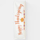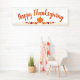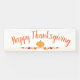 A Thanksgiving banner that says “Happy Thanksgiving” in large orange letters and has an illustration of a friendly, smiling, cartoon, pumpkin. The pumpkin is surrounded by colorful autumn leaves on the ground. The main color scheme of the banner is white and orange.