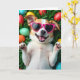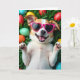 This card shows a small light-furred puppy lounging in thick green grass, its body angled in close-up as if it just flopped down beside you. Heart-shaped glasses in bright pink sit across its face, giving it a flirty, friendly look that feels like it’s posing for someone it adores 🌷. The pup’s mouth is open in a big grin, with a rosy tongue and tiny white teeth catching the light. Around it, smooth egg-shaped decorations in red, blue, yellow, and green peek up between the blades, adding a springtime mood 🐇. Bright, diffused lighting softens the shadows and brings out the texture of the fur and the sheen on the colorful shapes. A short greeting appears near the top in a pink font, while a smaller line of text sits near the bottom in a lighter color for balance. The puppy’s front paws are lifted slightly, and the heart-shaped glasses gleam against the lush grass and scattered eggs.