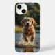 A joyful golden retriever puppy having fun in the sun, splashing through crystal-clear water.
