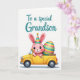 This card features a stylized pink bunny with big upright ears, rosy cheeks, and a friendly smile, giving the scene a sweet, affectionate tone 🐰. The bunny wears a small cone-shaped party hat with horizontal teal, yellow, and pink stripes, finished with a round yellow topper. It sits at the wheel of a bright canary-yellow convertible with rounded curves and a few silvery accent details, like it’s heading out on a cheerful little date with a friend. In the back of the car, an oversized decorative egg rides along, hinting at a shared celebration and a caring gesture. The egg is decorated with wide teal, yellow, and soft pink bands, plus tiny speckles that add texture. The background stays plain white so the candy-like colors stand out, and a 🌷 emoji would feel right at home beside the artwork. Near the top, a flowing teal message is centered above the illustration, with the letters spaced to float comfortably over the scene. The car’s wheels are dark with simple circular hubs, and the giant egg sits snugly in the rear compartment behind the bunny.
