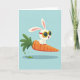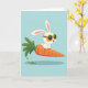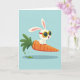 Designed with a friendly, romantic touch, this card shows an anthropomorphic white bunny perched high on a huge orange carrot 🐰. The bunny wears oversized round glasses with gold frames and dark lenses, and its open-mouthed grin is softened by a faint blush that reads like a bashful laugh shared with a close friend. Long ears stretch upward with pale pink inside, adding a gentle warmth against the simple sky-blue background. The carrot is shaded in rich orange tones, with a thick burst of leafy green at the top that leans slightly as if caught mid-glide. Any text sits near the top in small, dark lettering, leaving the character and carrot to take center stage 🌷. From the leafy crown, glossy green droplets fall in a short trail, gathering into tiny reflective puddles below. A thin, elongated shadow rests underneath the floating carrot, grounding the scene against the blue field.