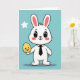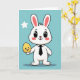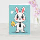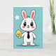 This card shows a cute, human-like bunny character centered on the front, looking straight at you with big dark eyes and rosy cheeks 🐰. It wears a white collared shirt with a black necktie, giving it a dressed-up look that feels sweetly attentive, like it’s showing up for someone special. One little tongue peeks out, adding a teasing, friendly note that reads like an inside joke between close friends. In its paws, the bunny holds a sunny yellow egg-shaped figure with a smiling face, as if it’s offering a small gift meant to be shared. The background is a smooth light blue field that resembles open sky, keeping the focus on the pair and their gentle connection. Any greeting text sits near the top in simple white lettering, with smaller matching text placed near the bottom for balance, and a tiny 🌷 accent nearby. The bunny’s long ears rise upward with soft pink inner details, while a small white star sits in the upper left corner.