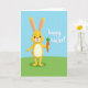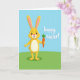 This card shows a cheerful, human-like bunny in sunny yellow, with soft pink inner ears and a creamy white chest, standing upright with an open, friendly smile 🐰. Its wide eyes and rosy cheeks give it a sweet, affectionate look, like it’s greeting someone it truly likes. The scene is split in two, with a rich green grassy strip along the bottom and a calm blue sky filling the top. In one paw, the bunny holds an orange carrot with a leafy green top, angled slightly upward as if offering it as a small gift between friends 🐇. On the right side of the sky area, a seasonal greeting appears in flowing white lettering, spaced to balance the character on the left. The colors stay bright and simple, with smooth shading that makes the bunny and carrot stand out against the plain background. The bunny is positioned left of center, with the white text floating to its right over the blue sky.