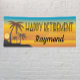 Happy retirement party banner with a beach scene in gold and blue with palm trees on an island and elegant fonts. Edit the name to your guest of honor. Fun for your beach loving coworker or any retirement party.