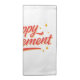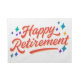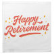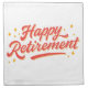 A white square napkin with the words "Happy Retirement" in a red, cursive font. There are small, yellow stars scattered around the words. The napkin is folded and has a textured surface.