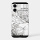 A black and white line art illustration on a phone case, depicting a Caucasian woman and white hair, relaxing in an ornate armchair. She is dressed in a suit, with a buttoned shirt underneath. The background includes a window with vertical blinds, a table with a vase of flowers, a cup, and books. Above the scene, the words "HAPPY RETIREMENT" is written in a decorative font. The style is reminiscent of a detailed coloring book page, with clear outlines and intricate patterns.