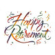 Watercolor lettering that reads "Happy Retirement" in a whimsical, calligraphic style, with the letters transitioning through a rainbow gradient of colors, from red to orange, yellow, green, blue, and purple, scattered confetti and streamers in matching colors around the lettering, set against a clean white background.