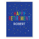 Happy Retirement card with custom name. Colorful typographic design with letters in many colors on a background of blue with gold and white stars. Inside says "Live Large!" The large size card will allow room for a group to write their well wishes.
