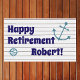 Happy Retirement party banner with a nautical theme: white painted boards look background with an anchor and a compass rose navigation symbol. Edit the text for your retiree. Fun for someone who plans to spend some retirement time on a boat!