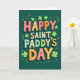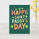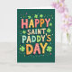 This greeting card features a deep teal background with “HAPPY SAINT PADDY’S DAY” stacked in four centered lines as the main focus. The chunky, raised-looking letters are colored in soft salmon, warm ochre, sky blue, and mint green, with gentle shadows that make them look like frosted treats. Each letter carries tiny patterns—polka dots, little stars, small hearts, and floral shapes—adding a sweet, affectionate touch, like a quiet nod to someone you adore. Scattered around the words are three- and four-leaf shamrocks in fresh greens, drifting like little lucky charms ☘️. Confetti-like specks—circles, diamonds, and starbursts—float across the scene in bright, friendly colors, creating the feel of a shared celebration 💚. The text stays centered and easy to read, with the dark background giving the pastel letters strong contrast. Shamrocks and confetti cluster more densely near the edges, framing the stacked message while leaving the center clear.