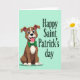 This card features a brown-and-white cartoon dog sitting on the left with bright blue eyes, a pink tongue showing, and a friendly grin that feels like it’s meant for a close friend 💚. The dog wears an emerald green bow tie, giving it a dressed-up look that suggests it’s ready to celebrate with someone special. A mint-green background keeps the scene airy while soft shading under the dog helps it feel grounded. On the right side, serif lettering reads “Happy Saint Patrick’s day” in a deep green color, spaced neatly so it balances the dog’s pose. The contrast between the warm browns, crisp white markings, and green accents creates a cozy, companionable mood, like a gentle nudge to share a laugh together ☘️. The dog’s white face markings and paws add definition, and its tail curves upward as if wagging. The layout is simple: dog on the left, green greeting text on the right, all set against a smooth mint field with subtle shadowing beneath the pup.
