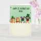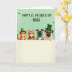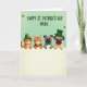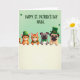 Designed with a festive, friendly look, this card features four cuddly animal pals peeking over a wide white banner, their paws resting along the top edge as if leaning in together. Two orange tabby-style cats with emerald eyes sit on the outer sides, one wearing a green top hat while the other has a green collar with a small golden buckle, giving them a sweet, close-knit look. Between them are two dogs: a gray pup in a tidy green bow tie and a fawn-colored, stout-nosed pup in a matching green top hat with a golden buckle, posed like loyal friends sharing the moment. Above the animals, the background fades through soft mint green tones and is lightly sprinkled with small clover shapes ☘️. Centered near the top, the message “HAPPY ST. PATRICK’S DAY NANA” appears in dark green lettering that stands out clearly against the pale background 💚. The text sits above the group, leaving the white banner below open and uncluttered, like a space for an extra note. The cats’ gentle smiles and the dogs’ bright, attentive eyes create a tender, affectionate scene, framed by green accents and warm orange-and-tan fur. Tiny clover motifs float across the mint gradient behind the headline, while the lower half remains a smooth, bright white panel.