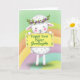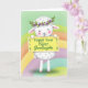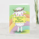 At the center of the card is an upright, human-like sheep with a fluffy white coat speckled with tiny gray dots, standing in front of a tall pastel rainbow. A leafy green crown with small purple blossoms rests on its head, giving it a spring garden look 🌷. Its eyes are gently closed and its wide smile lifts rosy cheeks, like it’s sharing a quiet, affectionate moment with whoever is holding the card. The sheep’s small white hands hold a sunny yellow sign with slightly uneven edges, as if it was carefully cut out and offered like a friendly gift 🐰. Across the sign, the message is written in green, flowing lettering centered on the yellow shape. Behind the character, the background is made of soft, curving bands of pale green, warm yellow, light lavender, and cool mint that sweep upward in a calm arc. Small details include a blush of pink inside the ears and slim little legs set against the layered pastel stripes.