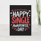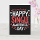 This card features the message “HAPPY SINGLE AWARENESS DAY” stacked in the center on a deep black background. The word “SINGLE” stands out in bright red, with thick, rounded letters that feel confident and fun 💘. “HAPPY” and “AWARENESS DAY” appear in white above and below it, using simple, easy-to-read letters. Small red and white hearts are scattered around the text, along with a few little white star shapes and thin red curl lines. The layout is neat and centered, so your eyes go straight to the message. A light shadow behind the letters adds a bit of depth without taking away from the simple look. Overall, it’s a cheerful card that celebrates being on your own with a smile ❤️.