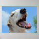 Photograph of a greyhound with his mouth open and eyes squinting in a happy dog smile.