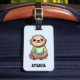 A luggage tag with an adorable illustration featuring a happy looking sloth wearing a green t-shirt. Sitting cross-legged looking relaxed.