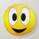 A cute round pillow of a happy smiling yellow face with big oval eyes and a sweet smile.