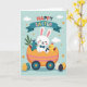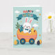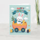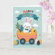 This card features a white rabbit with pink-lined ears, rosy cheeks, and a blue bow tie, seated snugly in an orange-and-pink striped eggshell that’s been turned into a little ride with dark blue wheels 🐰. Two tiny birds share the trip, one teal with a small head feather and one yellow with a red comb, leaning in close as if enjoying the moment together. A small green sprig juts from the egg-ride, adding a fresh spring touch. Near the top, a teal ribbon banner stretches across the sky with a festive greeting written in multi-colored letters, centered and easy to spot 🌷. The background is a pale blue with soft clouds and scattered golden stars, giving the scene a light, airy look. Along the bottom edge, patterned eggs in yellow, blue, white, and black sit in a neat row, decorated with stripes, dots, and curling swirls. The rabbit’s gentle smile and the birds’ relaxed posture suggest a sweet bond as they travel side by side. The teal banner curves above them while the decorated eggs form a colorful border beneath.