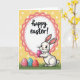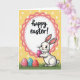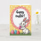 This card shows a white, long-eared bunny standing front and center, with bright eyes and a small, tender smile that feels like it’s meant for a close friend. It holds a large polka-dotted egg in its paws as if offering it gently, adding a romantic, caring touch to the pose 🐰. Along the bottom, a strip of green grass supports three more decorated eggs in magenta, blue, and red, each dotted with small white spots. The background is sunny yellow with faint white dots scattered across it, keeping the scene light and springlike 🌷. Near the top, a large round label with a scalloped pink border frames a white center area. Inside that white circle, the words “happy easter!” appear in flowing black lettering, centered and easy to read. The bunny’s ears tilt slightly upward, and its paws wrap around the egg while the dotted yellow backdrop and pink-edged circle sit above the grass line.