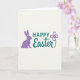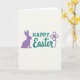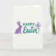 This greeting card features a soft, creamy background with a calm, modern layout that feels friendly and close. Centered text reads “HAPPY” in teal, using a sturdy, simple letter style that sits confidently near the top. Just beneath it, a second teal word is written in a flowing, decorative letter style, giving the message a gentle, affectionate tone. On the left side, a rounded violet silhouette of a long-eared bunny 🐰 sits in profile, as if quietly keeping someone company. On the right, a small violet flower 🌷 with four petals and a slim, curving stem balances the scene like a sweet nod across the page. A slightly darker outline traces the teal lettering and the violet shapes, adding depth while keeping the artwork flat and tidy. The bunny and flower are spaced evenly on either side of the centered words, with the violet lines crisp against the creamy backdrop.