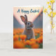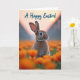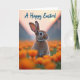 Designed with a tall, vertical layout, this card centers on a small brown-and-white bunny with upright ears and glossy dark eyes 🐰. Warm golden light brushes its fur, catching the fine texture and lighting up a few delicate whiskers as it sits alert among orange, cup-shaped flowers. The blossoms fill the foreground and middle distance, softly blurred around the bunny so it feels like a quiet, private moment in a wide field 🌷. Behind them, the sky shifts from blush pink near the horizon to pale blue above, like early evening settling in. Near the top edges, faint dark building shapes add a gentle frame without pulling attention away from the bunny. The greeting “A Happy Easter!” is placed high across the sky in elegant blue lettering, arcing slightly over the scene. The bunny’s calm, attentive posture against the sea of flowers gives the image a tender, companionable feel. A few shadowy rooflines and corners sit near the upper border against the fading blue sky.