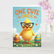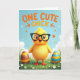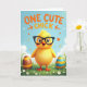 This card shows a fluffy golden-yellow baby bird centered under a bright blue sky with soft white clouds, giving the scene a light spring feel 🌷. The bird has wide blue eyes behind oversized dark-rimmed glasses, and its open orange beak looks like it’s mid-chirp, as if greeting a friend. A few tiny heart shapes and curled ribbon bits drift around it, adding a sweet, affectionate touch without stealing focus 🐰. Along the top, a short message appears in orange lettering, with small arrows pointing down toward the bird. Below, a field of rich green grass is dotted with small white daisy-like flowers that frame the character like a little garden stage. On the left sits a large egg with warm brown and sunny yellow stripes, and on the right another egg shows cool blue bands mixed with bright orange. The overall lighting stays soft and airy, with scattered white petal shapes floating near the bird’s head and across the sky.