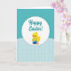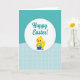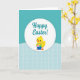 This greeting card features a round, sunny yellow chick centered inside a large white circle, holding a small deep-blue basket with two decorated eggs, and it adds a sweet touch of spring with 🌷. The chick’s tiny orange beak and lightly rosy cheeks pair with wide, gentle eyes that feel like an affectionate glance shared with the viewer. Above and around the character, a looping seasonal greeting appears in deep teal, positioned within the white circle so it stands out clearly. The background is split into two calm sections: a solid deep teal band on top and a lighter aqua-blue area below. The lower section includes a tidy grid pattern that resembles a tiled surface, giving the scene a cozy, homey setting. One egg shows soft pink stripes while the other is green with small dotted texture, tucked together in the basket like a friendly pair 🐰. The cool blues and teals frame the warm yellow bird, and the basket’s handle curves upward in dark blue against the bright white circle.